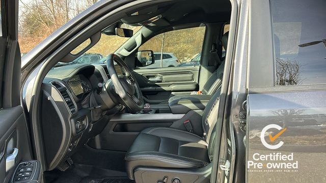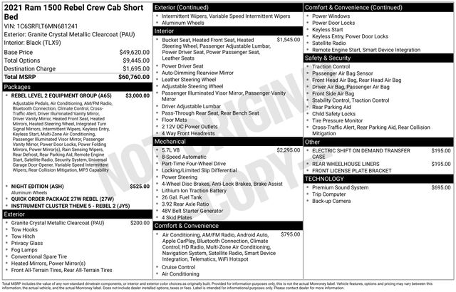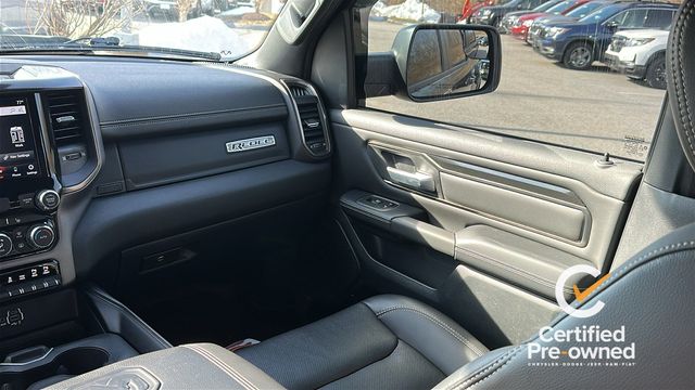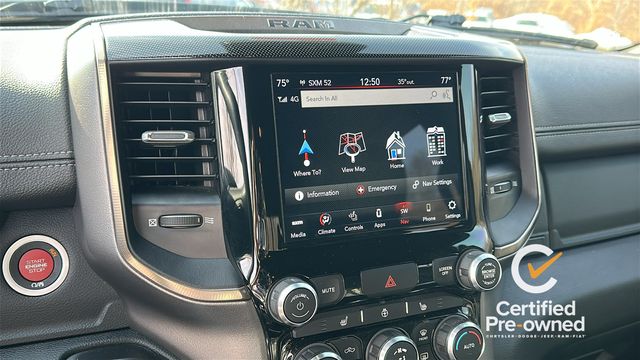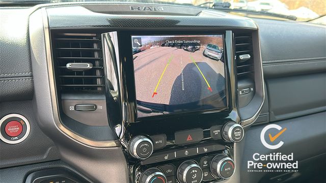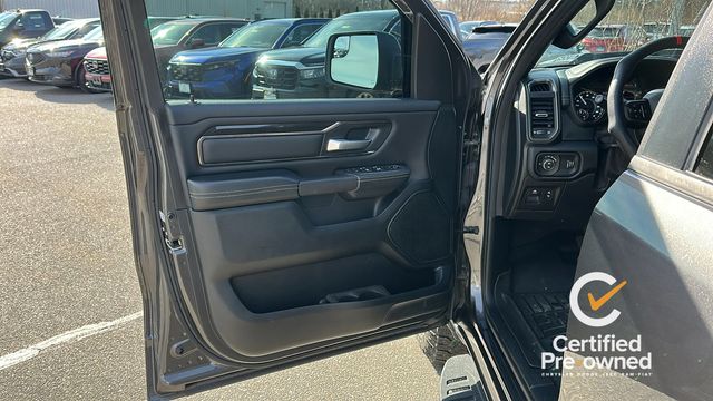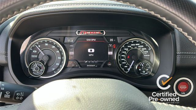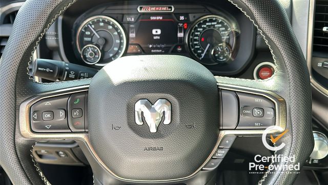 NAVGATION/GPS, 1-Yr SiriusXM Guardian Trial, 115V Auxiliary Rear Power Outlet, 3.92 Rear Axle Ratio, 4 Way Front Headrests, 4-Wheel Disc Brakes, 48V Belt Starter Generator, 4G LTE Wi-Fi Hot Spot, 5-Year SiriusXM Traffic Service, 5-Year SiriusXM Travel Link Service, 6 Speakers, 8.4" Touchscreen Display, 9 Amplified Speakers w/Subwoofer, ABS brakes, Air Conditioning, Air Conditioning ATC w/Dual Zone Control, Alloy wheels, AM/FM radio: SiriusXM, Apple CarPlay, Auto-Dimming Exterior Driver Mirror, Auto-dimming Rear-View mirror, Black Exterior Mirrors, Black Front Bumper w/Black Plate, Black Premium Power Mirrors, Body Color Door Handles, Brake assist, Bucket Seats, Cloth/Vinyl Low Back Bucket Seats, Compass, Delay-off headlights, Disassociated Touchscreen Display, Driver door bin, Dual front impact airbags, Dual front side impact airbags, Electric Shift-On-Demand Transfer Case, Electronic Stability Control, Exterior Mirrors Courtesy Lamps, Exterior Mirrors w/Supplemental Signals, Foam Bottle Insert (Door Trim Panel), For Details, Visit DriveUconnect.com, For More Info, Call 800-643-2112, Front anti-roll bar, Front Bucket Seats, Front Center Armrest w/Storage, Front fog lights, Front reading lights, Front Seat Back Map Pockets, Front wheel independent suspension, Full Length Upgraded Floor Console, Fully automatic headlights, Google Android Auto, GPS Antenna Input, GPS Navigation, Grille Moustache Black Outline Texture 3, HD Radio, Heated door mirrors, Heated Front Seats, Heated Steering Wheel, Illuminated entry, Instrument Cluster Theme 5 - Rebel 2, Integrated Center Stack Radio, Integrated Voice Command w/Bluetooth, Leather steering wheel, Low tire pressure warning, Media Hub w/2 Charge Only USBs, Night Edition, Occupant sensing airbag, Outside temperature display, Overhead airbag, Overhead console, Panic alarm, ParkSense Front/Rear Park Assist w/Stop, ParkView Rear Back-Up Camera, Passenger door bin, Passenger vanity mirror, Power 4-Way Driver Lumbar Adjust, Power Adjustable Pedals, Power door mirrors, Power driver seat, Power steering, Power windows, Power-Folding Mirrors, Quick Order Package 27W Rebel, Radio data system, Radio: Uconnect 3 w/5" Display, Radio: Uconnect 4 w/8.4" Display, Radio: Uconnect 4C Nav w/8.4" Display, Rain Sensitive Windshield Wipers, RAM Grille Badge - Black, Rear 60/40 Folding Seat, Rear anti-roll bar, Rear Dome w/On/Off Switch Lamp, Rear seat center armrest, Rear step bumper, Rear Underseat Compartment Storage, Rear Wheelhouse Liners, Rear Window Defroster, Rebel Level 2 Equipment Group, Remote keyless entry, Remote Proximity Keyless Entry, Remote Start System, Security Alarm, SiriusXM Radio Service, SiriusXM Satellite Radio, SiriusXM Traffic Plus, SiriusXM Travel Link, Speed control, Split folding rear seat, Steering wheel mounted audio controls, Sun Visors w/Illuminated Vanity Mirrors, Tachometer, Telescoping steering wheel, Tilt steering wheel, Traction control, Trip computer, Universal Garage Door Opener, USB Host Flip, Variably intermittent wipers, Voltmeter, Wheels: 18" x 8.0" Gloss Black, Wheels: 18" x 8.0" Painted Mid-Gloss Black.