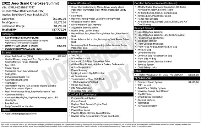 If youâre looking for top-tier luxury combined with Jeep capability, this 2022 Jeep Grand Cherokee Summit 4WD delivers at the highest level. Equipped with Luxury Tech Group V and ADV Protech Group IV, this Summit features Nappa leather, night vision technology, adaptive suspension, and a 19-speaker premium audio system â" making it one of the most advanced Grand Cherokees available.